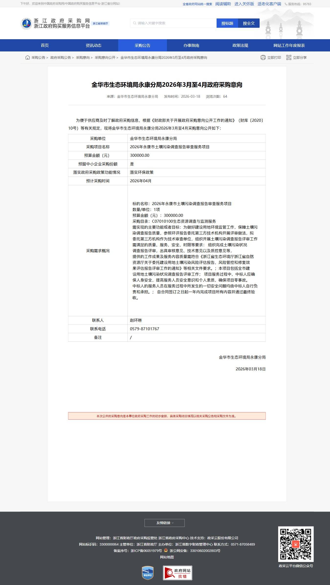 浙江金華市生態(tài)環(huán)境局永康分局2026年3月至4月政府采購意向公告