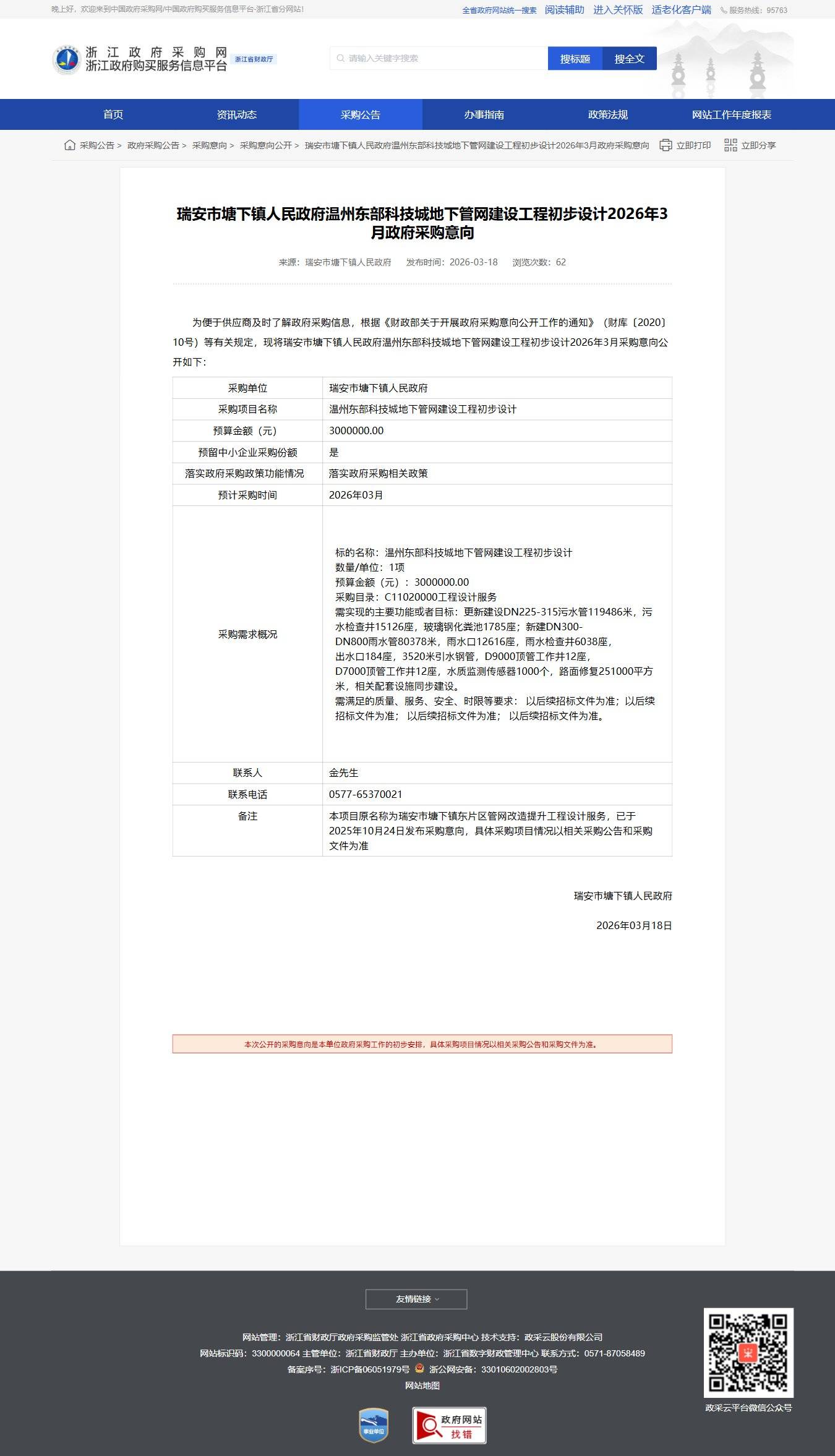 浙江瑞安市塘下鎮人民政府溫州東部科技城地下管網建設工程初步設計2026年3月政府采購意向公告
