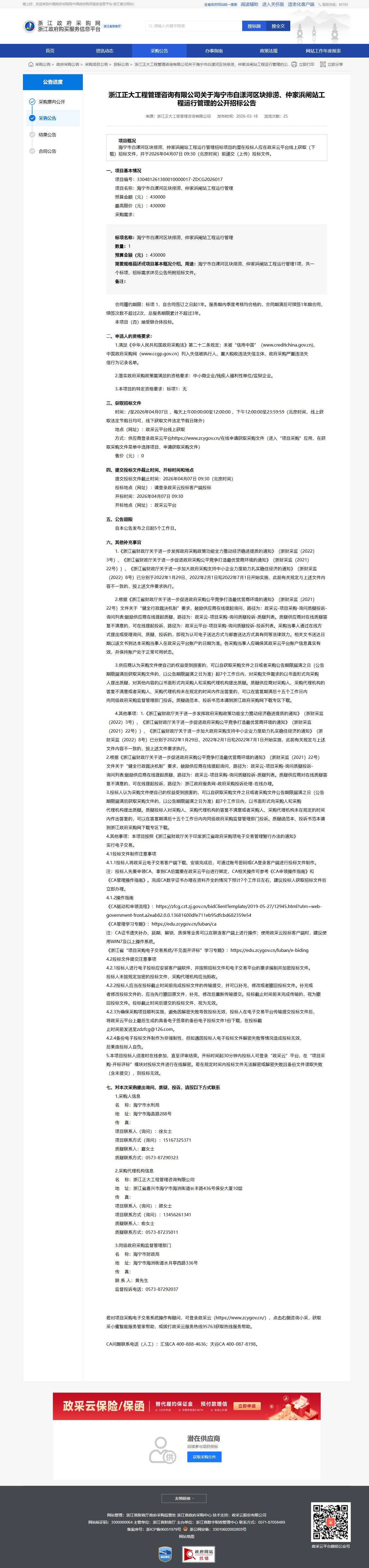 海寧市白漢河區塊排澇、仲家浜泵站工程運行管理的公開招標公告