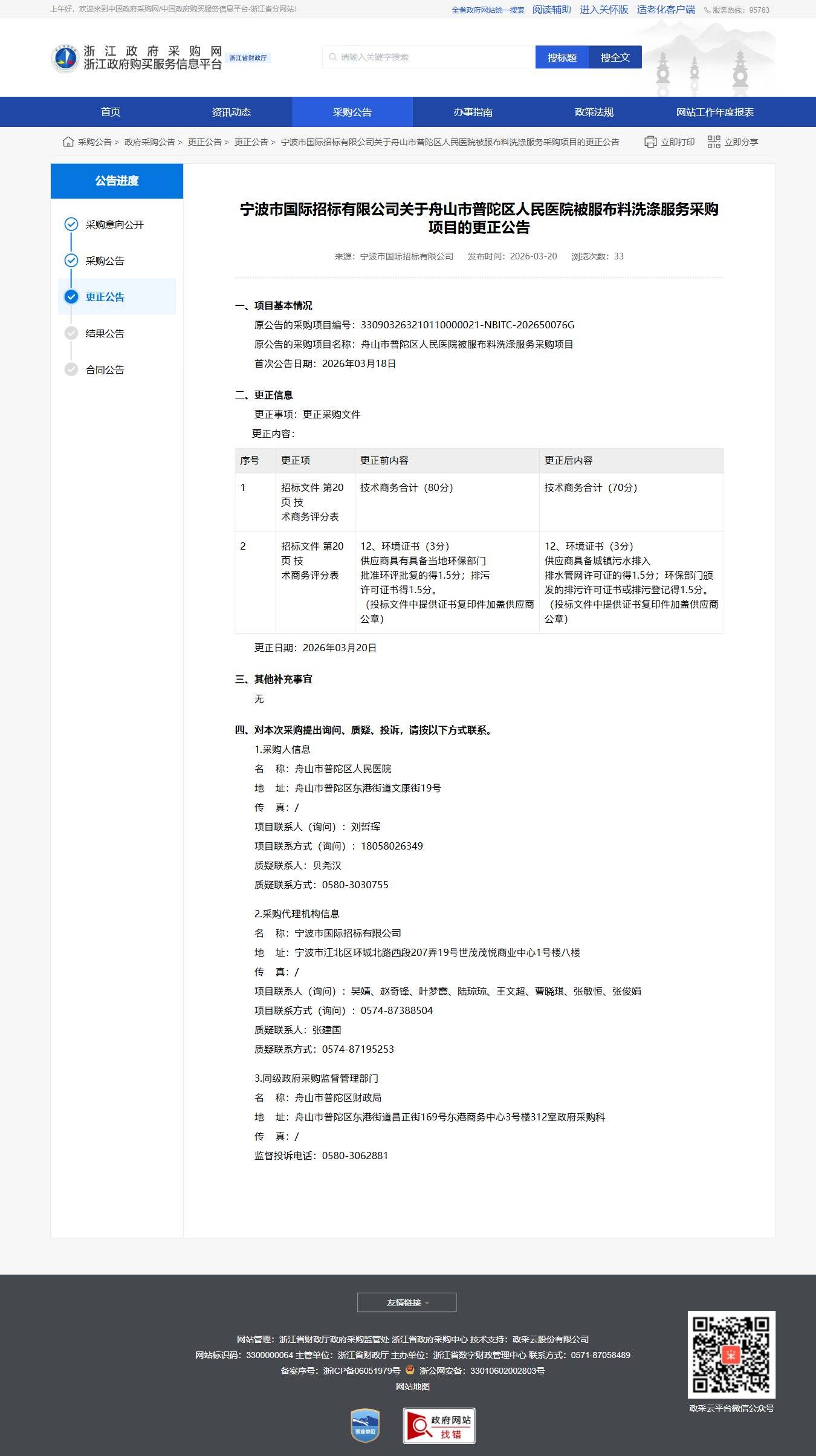 浙江關于舟山市普陀區人民醫院被服布料洗滌服務采購項目的更正公告