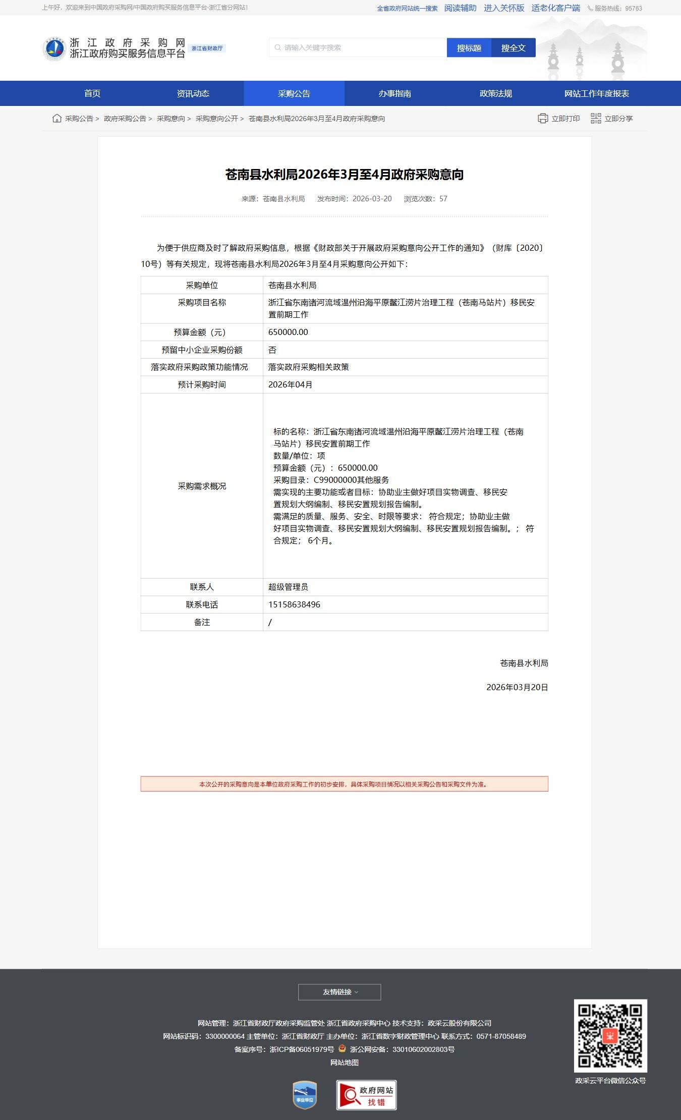 浙江蒼南縣水利局2026年3月至4月政府采購意向公告
