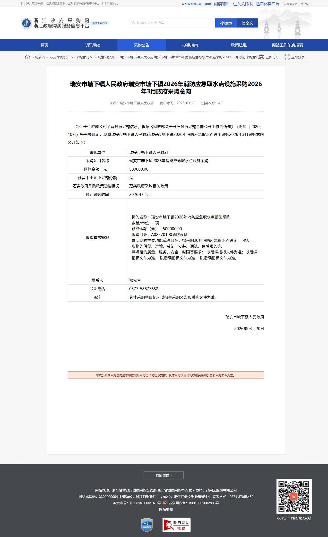 浙江瑞安市塘下鎮(zhèn)人民政府瑞安市塘下鎮(zhèn)2026年消防應(yīng)急取水點(diǎn)設(shè)施采購2026年3月政府采購意向公告