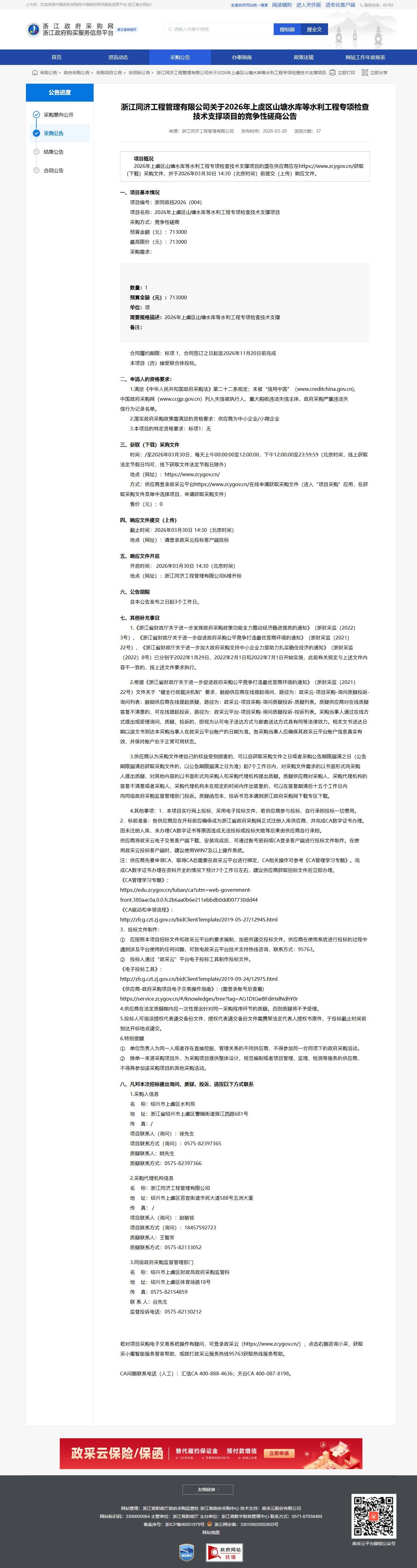 浙江同濟(jì)工程管理有限公司關(guān)于2026年上虞區(qū)山塘水庫(kù)等水利工程專項(xiàng)檢查技術(shù)支撐項(xiàng)目的競(jìng)爭(zhēng)性磋商公告發(fā)布時(shí)間:2026-03-20