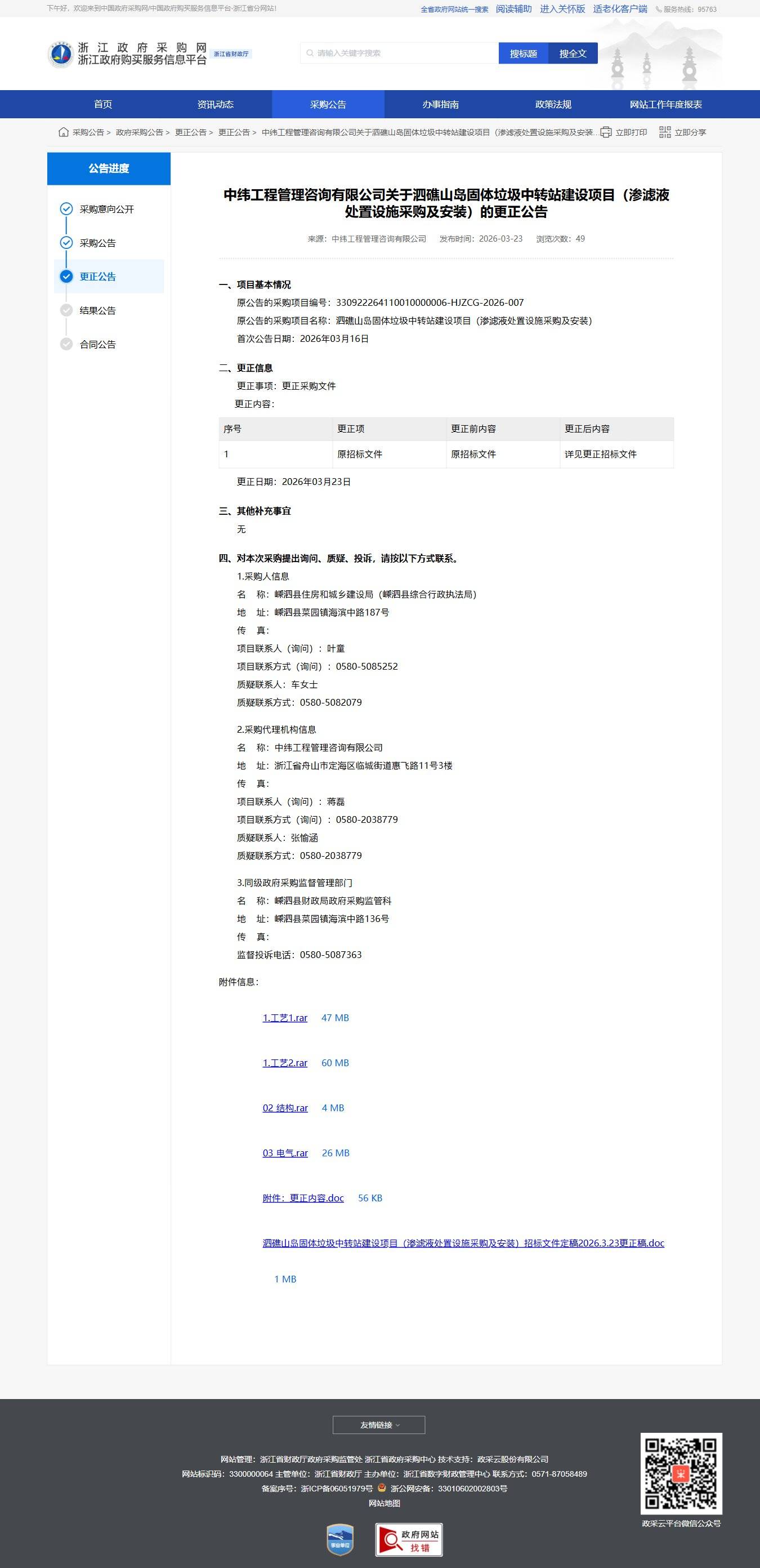 浙江關于泗礁山島固體垃圾中轉站建設項目(滲濾液處置設施采購及安裝)的更正公告