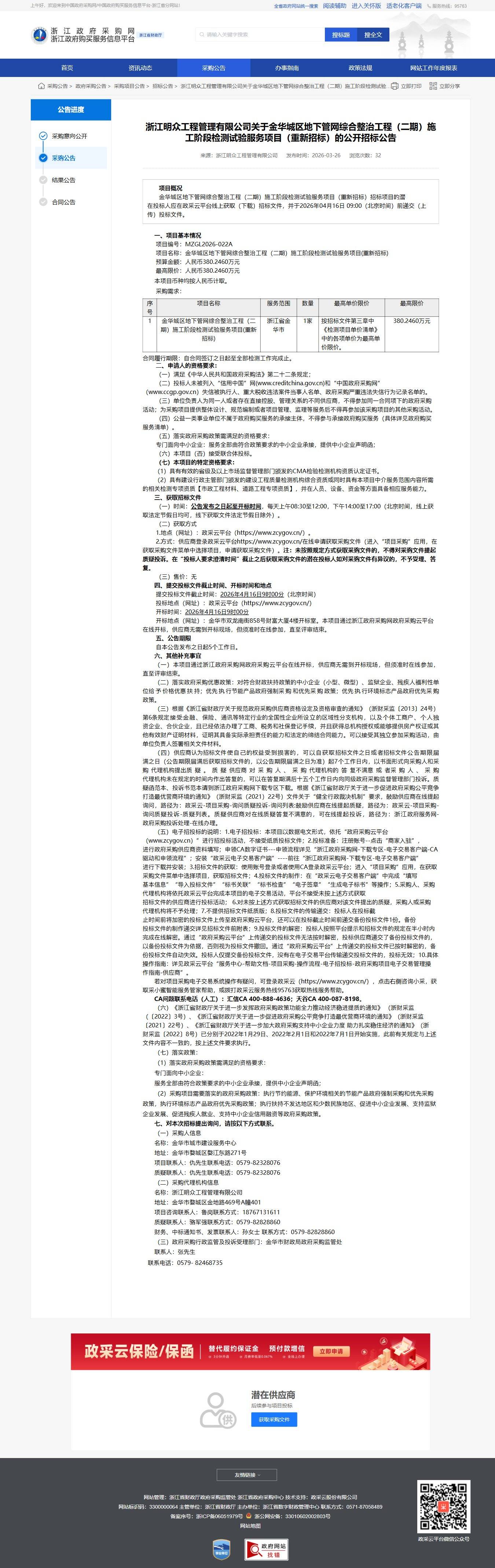 政府采購公告>招標公告>浙江明眾工程管理有限公司關于金華城區地下管網綜合整治工程(二期)施工階段檢測試驗服務項目的公開招標公告