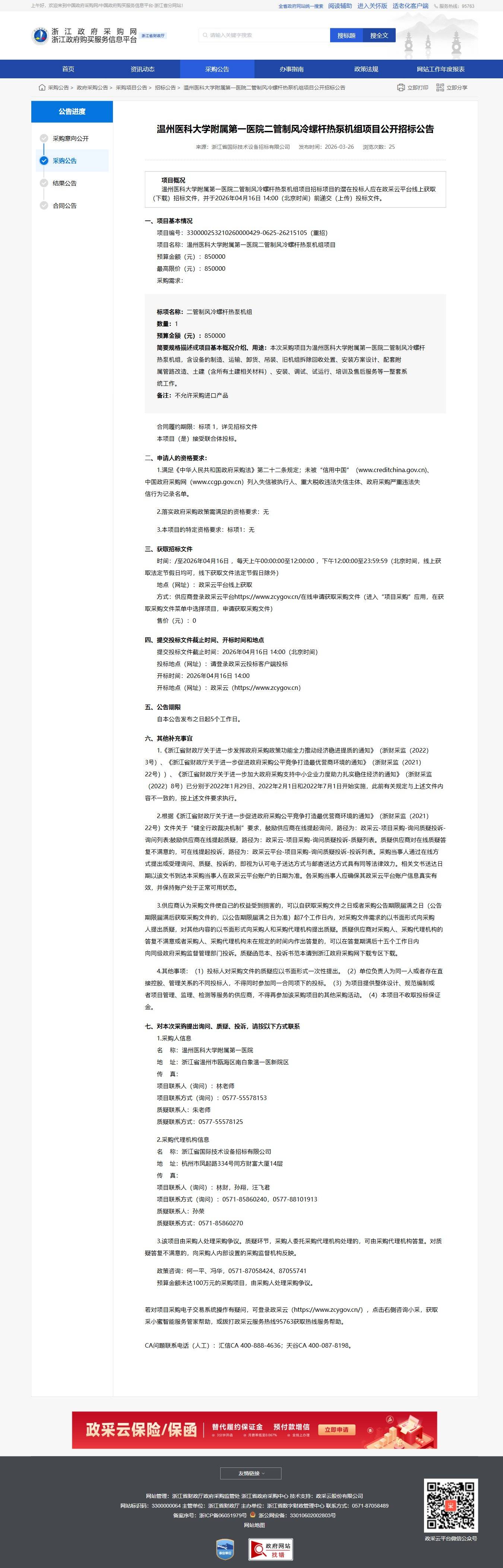 **溫州醫科大學附屬第一醫院二管制風冷螺桿熱泵機組項目公開招標公告**
