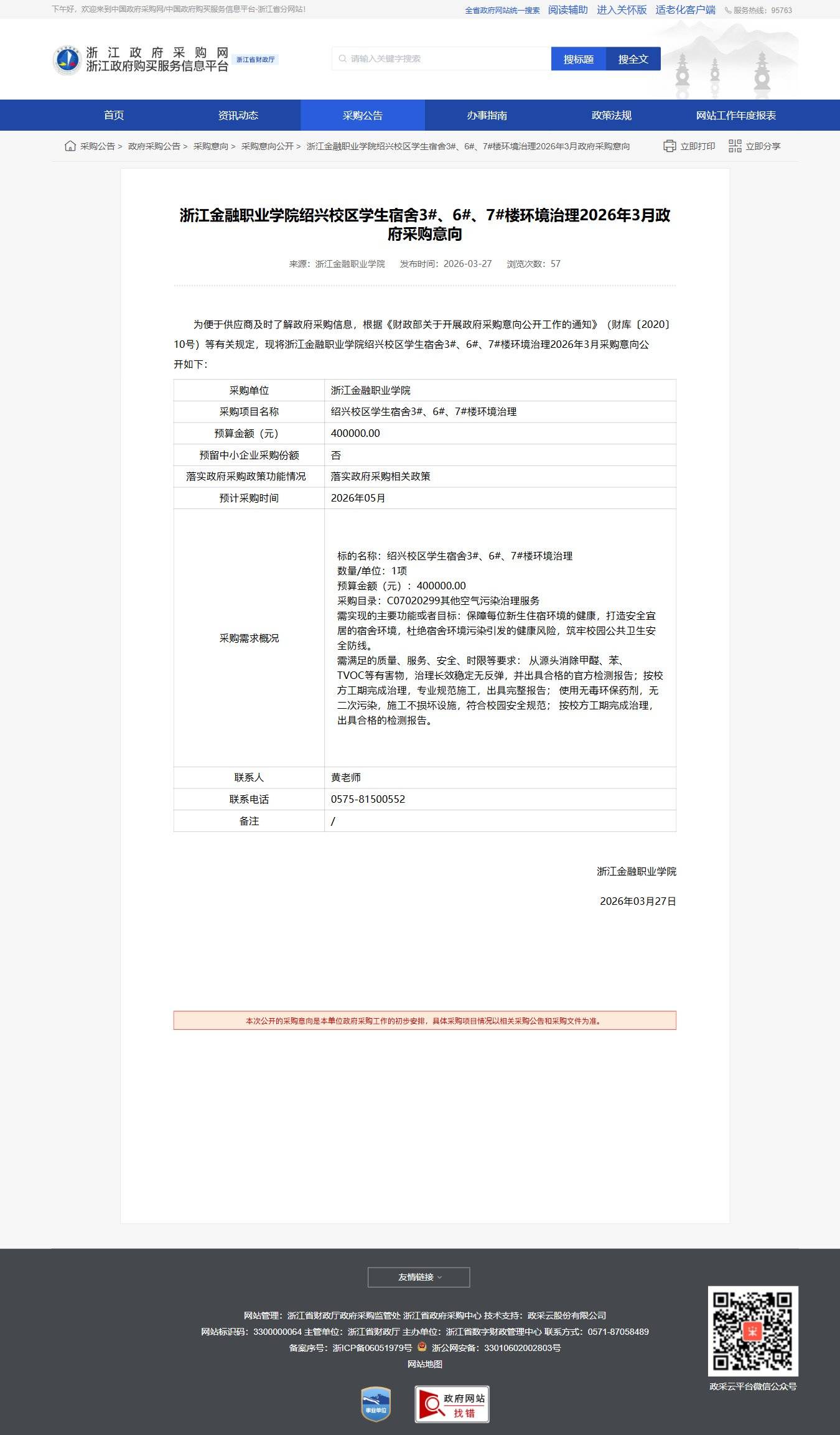 浙江金融職業學院紹興校區學生宿舍3#、6#、7#樓環境治理2026年3月政府采購意向公告