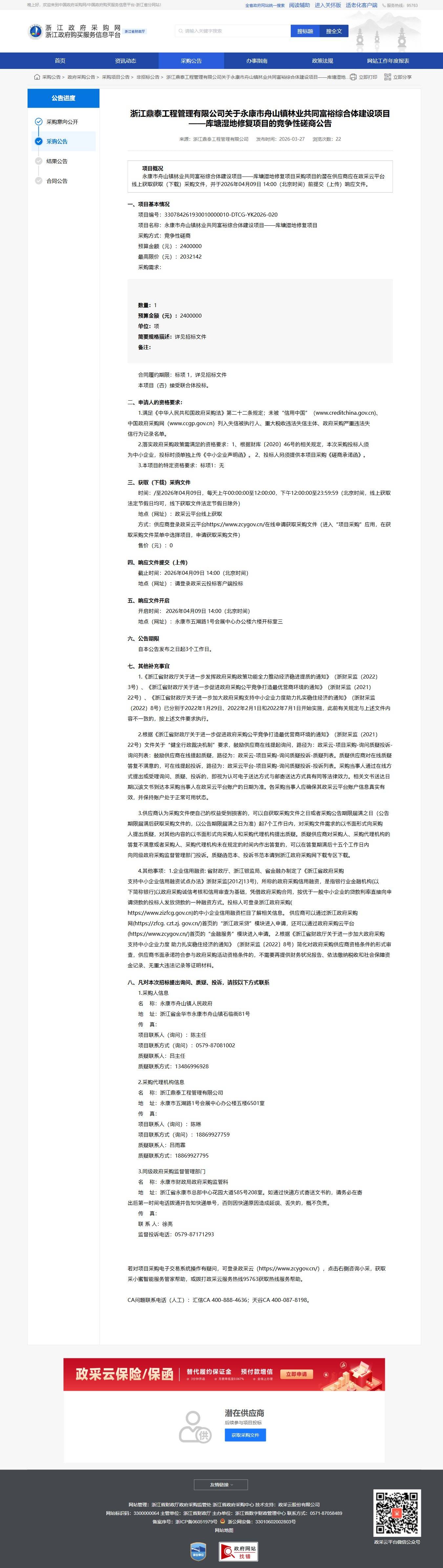 浙江關于永康市舟山鎮林業共同富裕綜合體建設項目——庫塘濕地修復項目的競爭性磋商公告