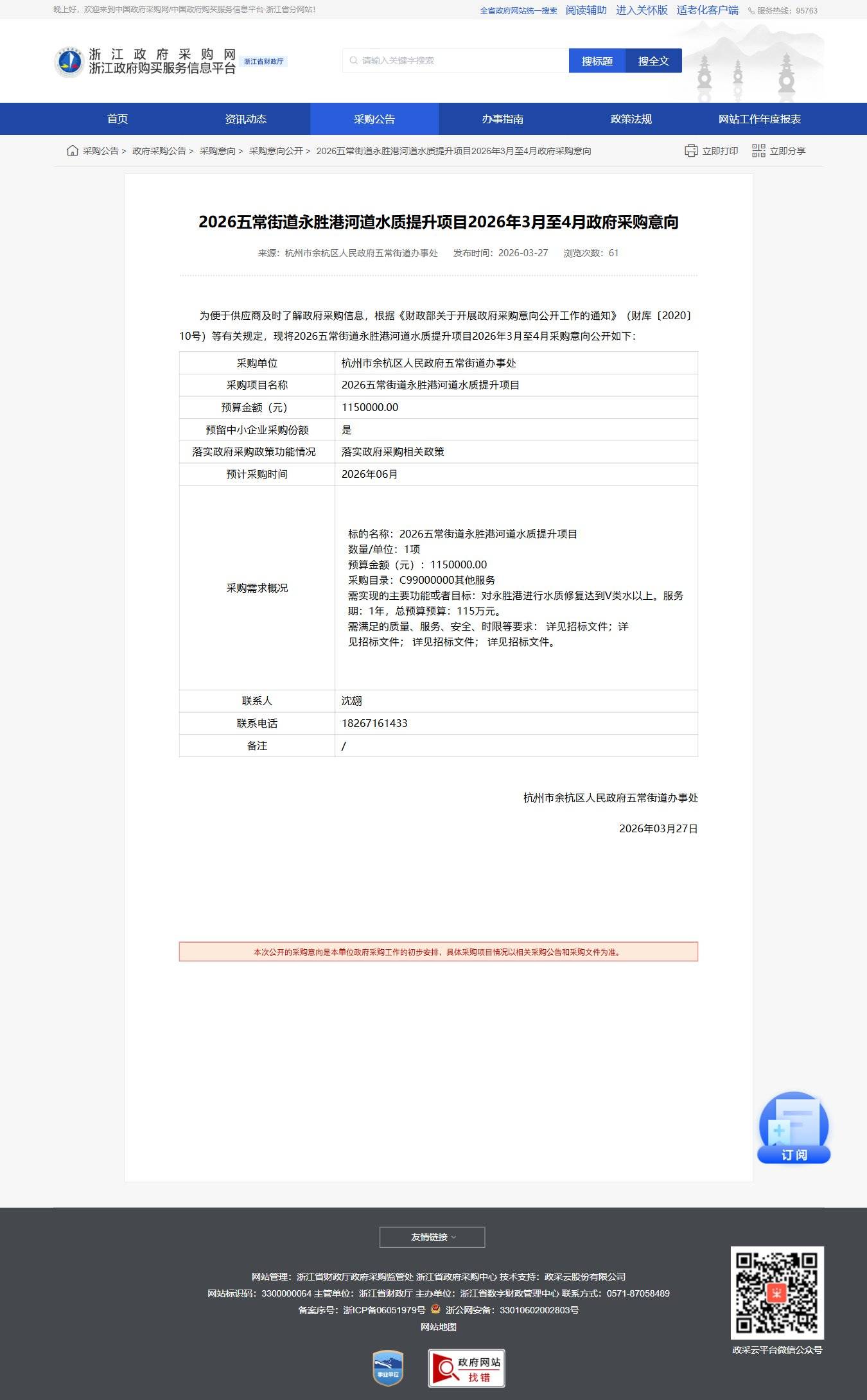 浙江2026五常街道永勝港河道水質提升項目2026年3月至4月政府采購意向公告